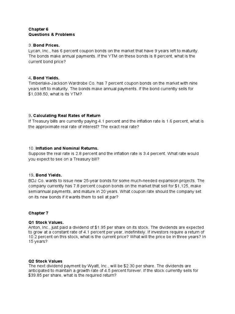 [Solved] Chamberlain Co. wants to issue new 20-yea - SolutionInn Chamberlain Co. wants to issue new 20-year bonds for some much-needed expansion projects. The company currently has 7 percent coupon bonds on the market that sell for $1,083, make semiannual payments, and mature in 20 years. What coupon rate should the company set on its new bonds if it wants them to sell at par? 7.6-7.7 Bonds: Inflation, Interest Rates,and Determinants of ... - Quizlet the ease in which an asset can be converted to cash without significant loss of value RWB Inc., has 6% coupon bonds on the market that have 10 years left to maturity. The bonds make annual payments. If the YTM on these bonds is 11%, what is the current bond price? A. $705.54 B. $1,000.00 C. $1,061.61 D. $1,134.11 E. $1,368.00 A. $705.54 Bond Coupon Interest Rate: How It Affects Price - Investopedia A bond's coupon rate denotes the amount of annual interest paid by the bond's issuer to the bondholder. Set when a bond is issued, coupon interest rates are determined as a percentage of the bond ... Finance Midterm 1 Flashcards | Quizlet If YTM = Coupon Rate... Price = Par Intrest Rate Risk increases when: -YTM increases -Price decreases -Coupon Rate decreases Premium Bond A bond that sells for more than the face value Zero Coupon Bond bond that makes no coupon payments, so its priced at a discount Discount Bond has a coupon rate that is less than the bond's YTM