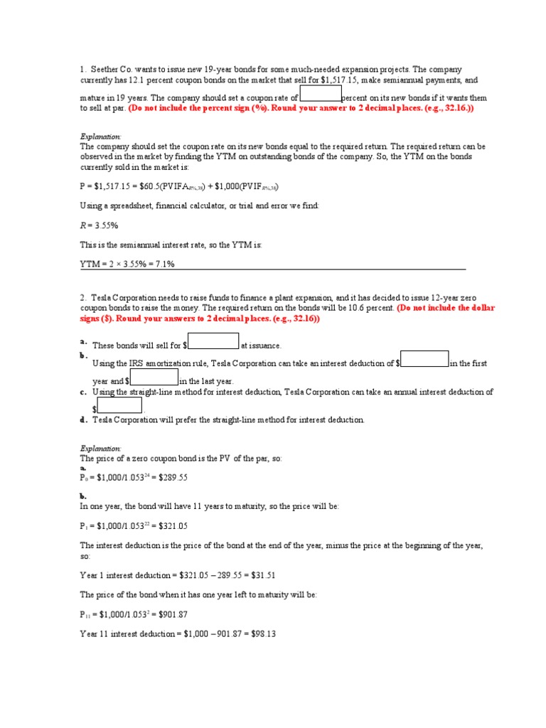 What coupon rate should the company set on its new bonds if it wants them to sell at par. BDJ Co. - Coupon Rate Bonds - BrainMass BDJ Co. wants to issue new 10-year bonds for some much-needed expansion projects. The company currently has 8 percent coupon bonds on the market that sell for $1,095, make semiannual payments, and mature in 10 years. What coupon rate should the company set on its new bonds if it wants them to sell at par? Solved Uliana Company wants to issue new 20-year bonds for - Chegg Expert Answer 100% (5 ratings) Transcribed image text: Uliana Company wants to issue new 20-year bonds for some much-needed expansion projects. The company currently has 6 percent coupon bonds on the market with a par value of $1,000 that sell for $967, make semiannual payments, and mature in 20 years. Answer in Finance for rim #9185 - Assignment Expert What coupon rate should the company set on its new bonds if it wants them to sell at par? 6.25 percent 6.37 percent 6.50 percent 6.67 percent 6.75 percent Expert's answer Coupon rate is annual payout as a percentage of the bond's par value. Compounding = semi annually Par Value = 1000 Market Rate = 6.5 Market Price = 972.78 N = 40 Airbutus co wants to issue new 20 year bonds for some What coupon rate should the company set on its new bonds if it wants them to sell at par? Assume the par value of a bond is $1,000. (Do not round intermediate calculations. Round the final answer to 2 decimal places.) Coupon rate 8.74 ± 1% % Explanation The company should