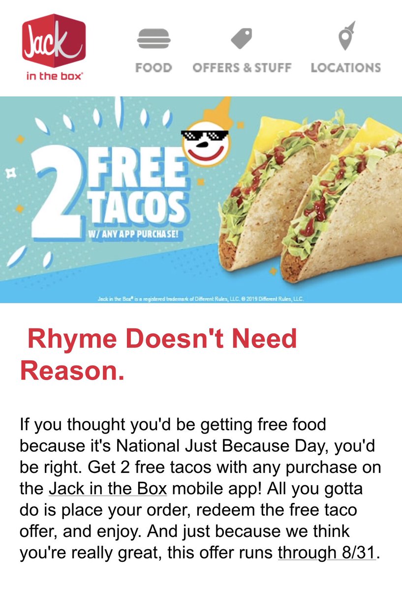 › coupons › birthday-tacosJack in the Box Jack in the Box. This website uses cookies to enhance user experience and to analyze performance and traffic on our website. We also share information about your use of our site with our social media, advertising and analytics partners.