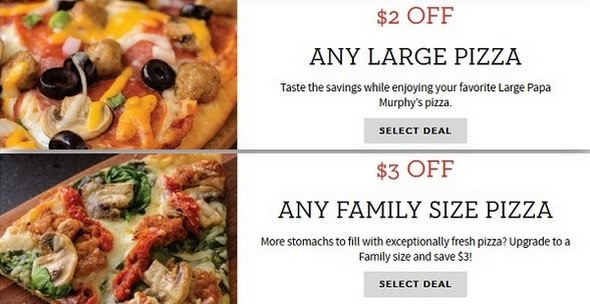Papa Murphy's Coupons | (EXTRA 25% Off) | December 2022 Papa Murphy's Coupons, Deals & Specials | Dec 2022 25% off Coupon Take 25% Off Online Orders w/ Coupon Code in Select Regions Get Coupon Code 93 Used Today 25% off Coupon Use Discount Code for 25% Off Your Order in Select Locations Get Coupon Code 45 Used Today $5 off Coupon Save $5 Off Orders $20+ w/ Coupon Code Get Coupon Code 26 Used Today